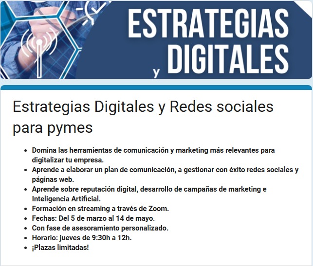 En el marco de las actividades que desarrollamos junto a la Cámara de Comercio de Málaga, te invitamos a participar en el programa “Estrategias Digitales y redes sociales para pymes”, que tendrá lugar en sesiones semanales del 5 de marzo al 14 de mayo, en formato online, de 9:30 a 12:00 horas.